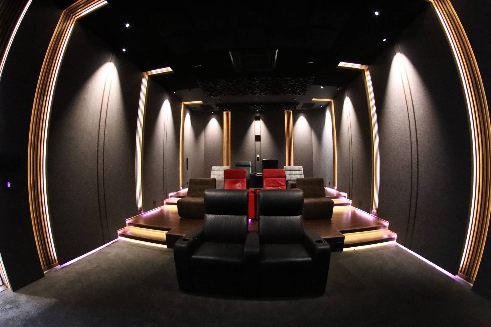 The current cinema measures 30 ft × 18 ft × 13 ft (9,1m × 5,5m × 4m) and is large enough to support a genuinely three-dimensional sound field across multiple seating rows, and challenging enough to demand serious calibration work. Twenty-two Genelec loudspeakers are distributed across three layers: nine at ear level, seven at height, and six overhead. The Genelec monitors were retained from the previous configuration, but the AV Processor was upgraded.
