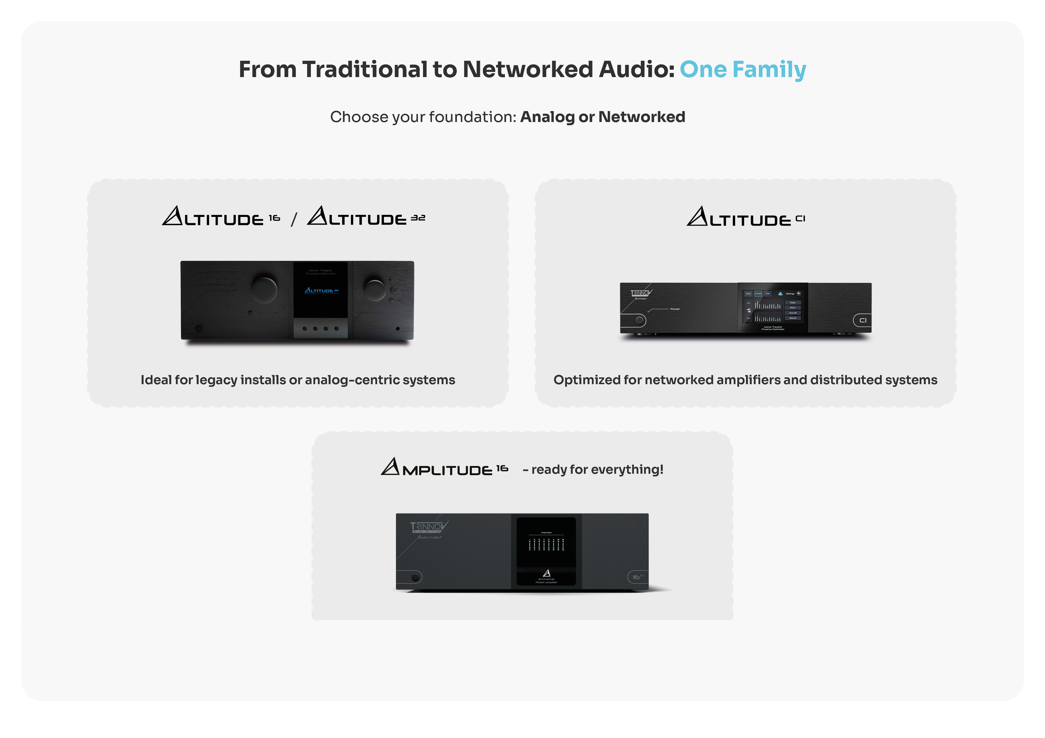 On one hand, the Altitude16 and Altitude32 remain the reference for analog-first systems, where integrators and audiophiles want freedom to use the vast majority of power amplifiers on the market. On the other side, the AltitudeCI introduces a new hardware platform, built for Custom Integration, with Audio over IP (AoIP) at its core and scalability that extends all the way to DCI-grade theaters and theatrical post-production.